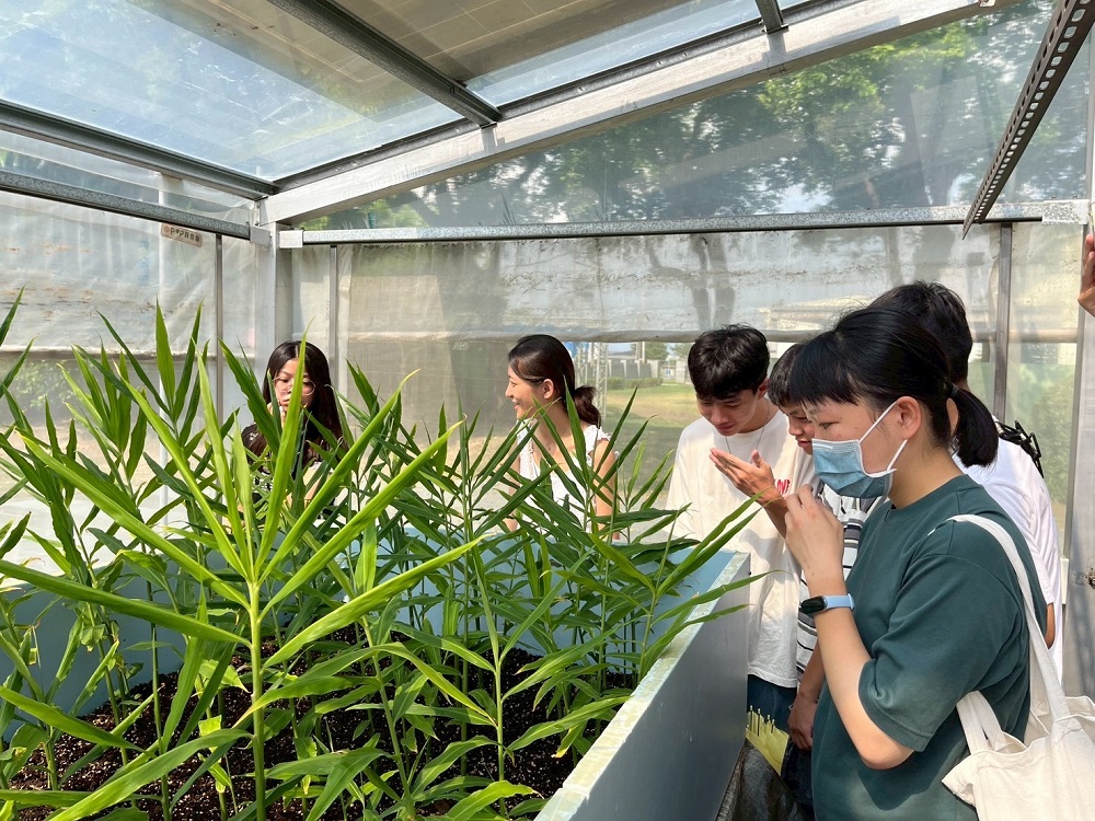學生走訪晁陽休閒農產第三型溫室,觀察栽種中的嫩薑草,了解永續農業與植物栽培技術。