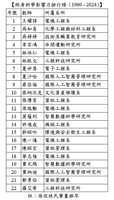 入榜學者的研究領域廣泛,涵蓋人工智慧與影像處理、工業工程與自動化、作業研究、奈米科學與奈米技術、能源、技職教育、英語教學、資訊系統、網路與電信等。其中,以人工智慧與資訊科學領域的學者人數最多,顯示本校持續引領並緊密銜接產業需求。更值得一提的是,在應用科學教育領域,本校有三位人文領域女性學者同時入榜,長期耕耘成果備受肯定,表現尤為亮眼。