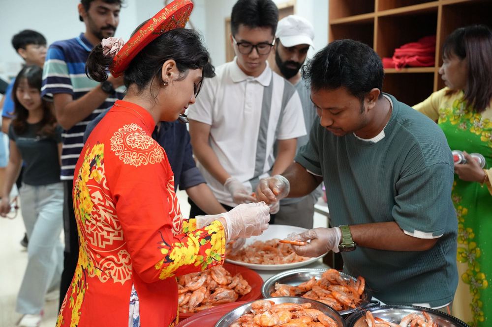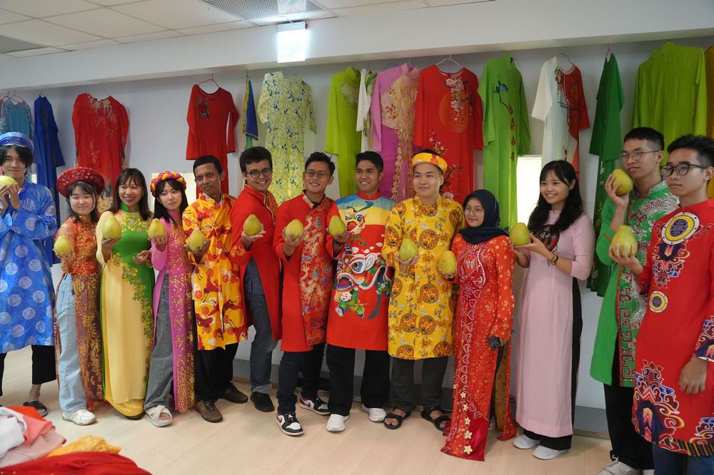 除了美食體驗,現場更開放越南傳統服飾 áo dài 試穿,無論本國生或國際生都踴躍參與,彼此合影留念,展現跨文化交流的友好氛圍。活動最後,所有參與的師生齊聚合照,並開心領取象徵佳節祝福的文旦,現場洋溢溫馨與感動的氛圍。