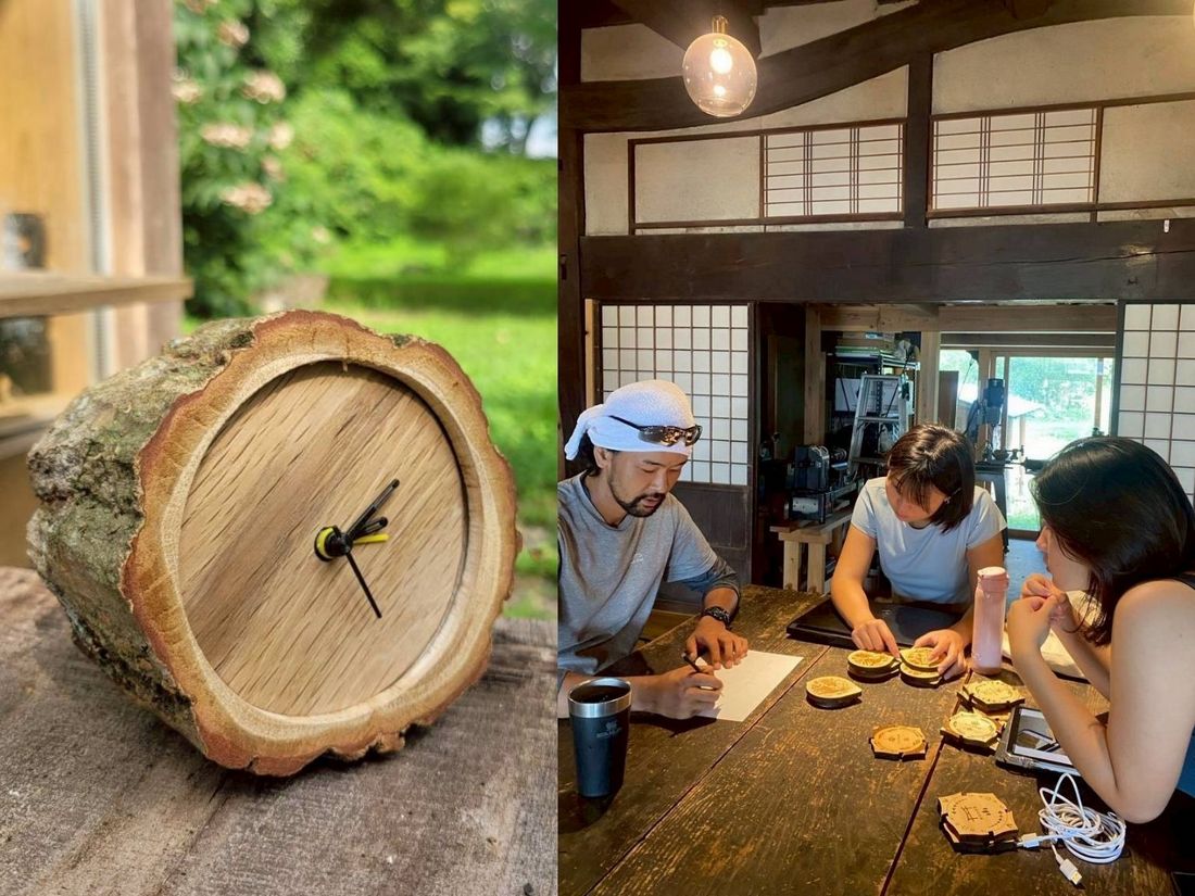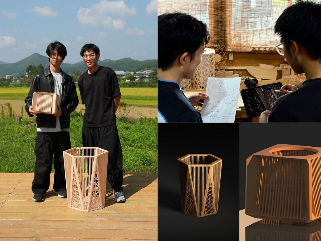 在京都京北的村山木工,汪彥廷與張碩宇同學在社長村山伸一及員工指導下,學習日本特有木工工法「組子」,並協助製作木窗修復、客製家具與杯墊等產品。第一個月,他們從最基礎的組子杯墊開始,透過零組件拼合、打磨與表面處理,熟悉工藝流程。除了基礎練習,他們也協助製作較複雜的產品。第二個月,他們進行原創設計,運用 Shapr3D 與 AR 科技規劃產品造型,將組子元素融入現代設計,並在工廠完成實體製作,實踐傳統工藝與現代科技的結合,展現了創新與工藝兼具的能力。