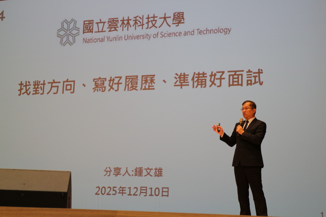 本校於114年12月10日舉辦大四學生週會講座,特別邀請到104資訊科技副總經理暨人才永續長鍾文雄蒞校,以「找對方向、寫好履歷、準備好面試」為題,分享當前就業市場趨勢、產業變化,以及新鮮人在履歷撰寫與面試準備上的實務技巧,協助即將踏入職場的學生掌握求職競爭力。