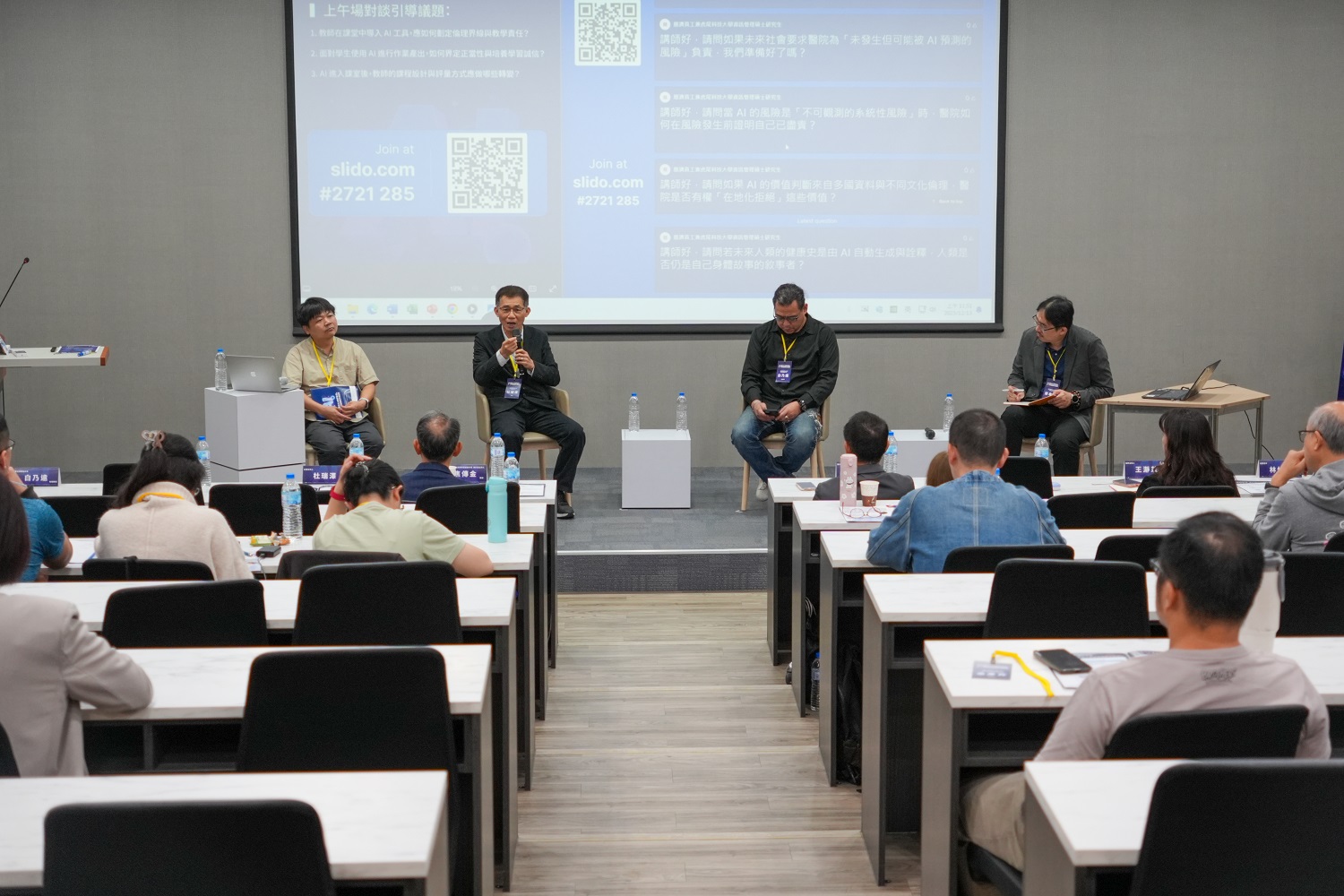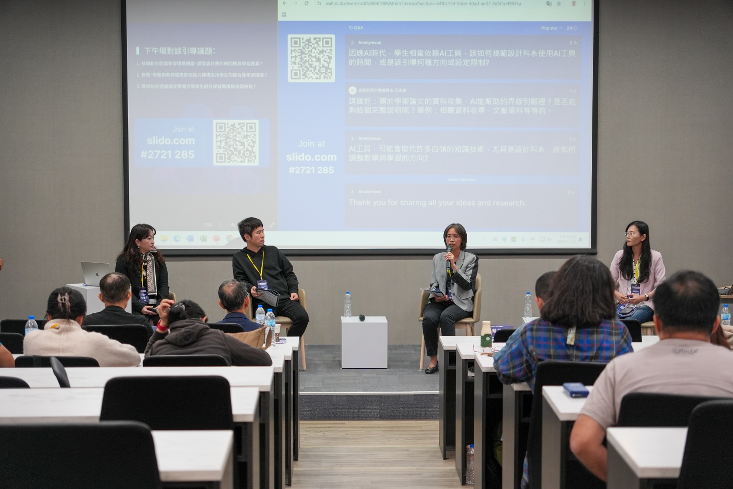 論壇同時安排兩場議題對談,透過現場與會者即時提問,促成講者間深入而熱絡的交流。計畫主持人、本校創意生活設計系杜瑞澤教授表示,設計學院近年亦積極推動院級通識課程,期望學生能具備基本的 AI識讀與倫理素養,從「懂用AI進階到「善用AI」,並逐步形塑自身的學習方向與價值定位。協同主持人蔡旺晉教授則指出,本校不僅鼓勵教師投入數位素養教學,也透過計畫支持辦理多場教師與學生專業增能活動與工作坊,完善大一新生的學習支持機制,亦使學校近年就學穩定率持續維持良好表現。另一位協同主持人王瀞苡教授亦強調,雖然計畫終有階段性任務完成的一天,但面對數位浪潮與新世代學生,教學若停滯不前,將難以回應教育現場的實際需求。透過跨院合作與交流,期盼未來能深化跨域素養導向教學,讓本校在推動數位素養的同時,也能兼顧AI教學倫理與學生學習適應,打造更具韌性的高等教育環境。