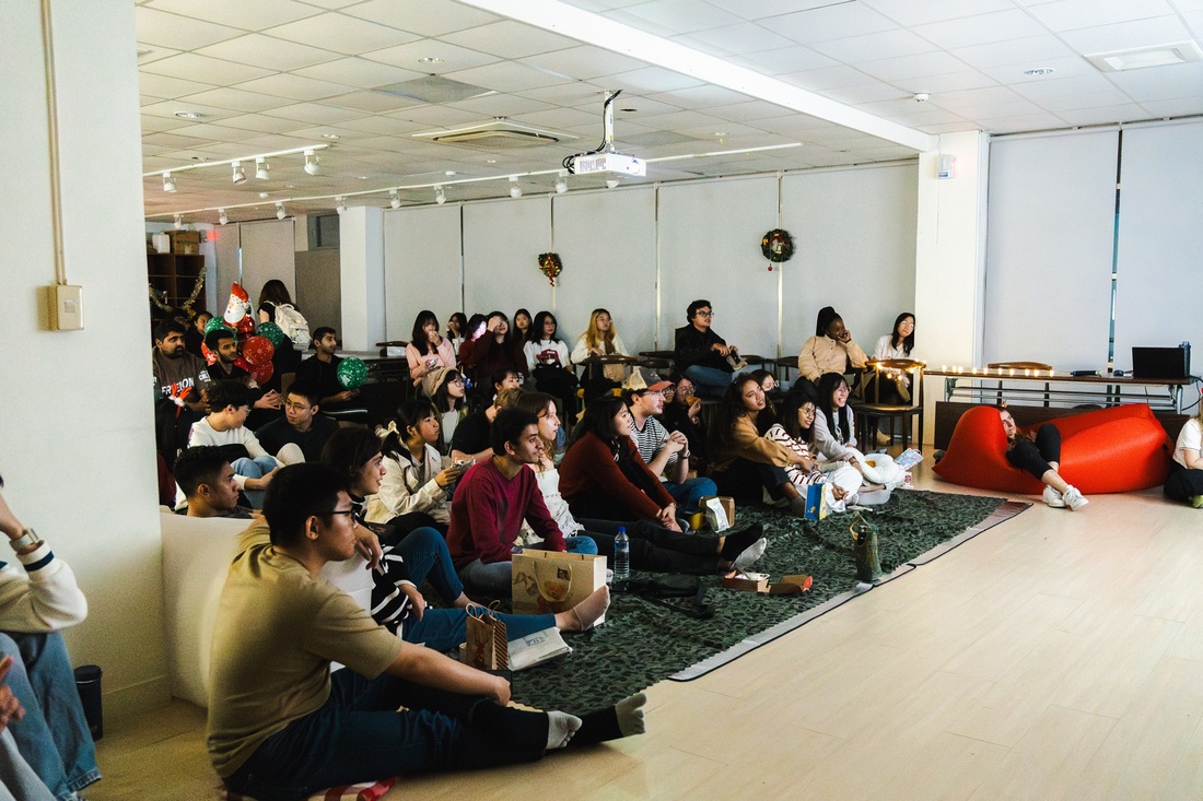學生們圍坐在鋪滿地毯、抱枕與坐墊的舒適空間,一邊觀賞聖誕電影,一邊享受療癒而愉悅的節日氛圍