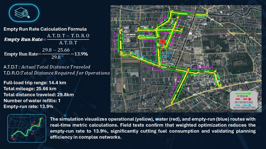 電機工程系助理教授陳靜茹團隊研發創新技術- SMART-SWEEP:具動態道路權重分級之智慧道路清掃最佳化系統,針對城市清潔痛點,開發基於「髒污權重」的動態排程演算法。突破傳統齊頭式清掃,依區域落塵量(如工業區與住宅區)設定高低頻作業權重,並整合取水點規劃,大幅降低無效里程。系統具備 Web-GIS 視覺化模擬平台,管理者可預覽動態軌跡、檢核衝突,並一鍵生成 KML 導航檔供司機使用。實證顯示能將空跑率大幅地降低,實現數據驅動的精準治理,顯著提升調度彈性與燃油效益,獲得金獎。 |